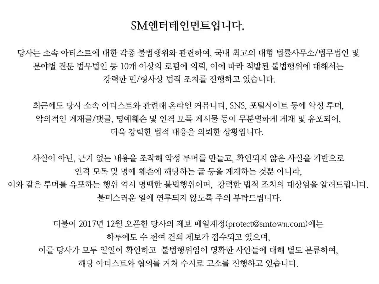 [D Official sm] SM Entertainment, liên quan đến các hành vi bất hợp pháp liên quan đến các nghệ sĩ trực thuộc, đã bị bắt bằng cách yêu cầu hơn 10 trang trại thấp như công ty luật / tập đoàn pháp lý lớn nhất ở Nhật Bản và tập đoàn pháp lý chuyên ngành theo lĩnh vực. Tuyên bố tiến hành các biện pháp pháp lý dân sự / hình sự mạnh mẽ chống lại các hoạt động bất hợp pháp.