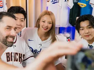 Trong bức ảnh được công bố, Hyoyeon và KANG MINHEEK đang mỉm cười rạng rỡ cùng huấn luyện viên Dave Roberts của LA Dodgers.