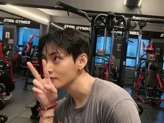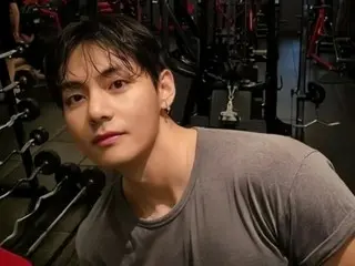 V đang tạo dáng hòa bình với mái tóc ướt đẫm mồ hôi. Cánh tay và ngực vạm vỡ của anh thu hút mọi ánh nhìn, trong khi vẻ ngoài tươi tắn, không trang điểm cũng vô cùng quyến rũ.