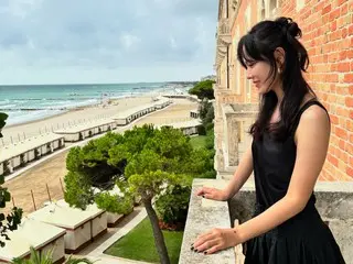 Trong ảnh, Son Ye Jin đang tạo dáng trên sân thượng của một tòa nhà với bãi biển ở phía sau.
