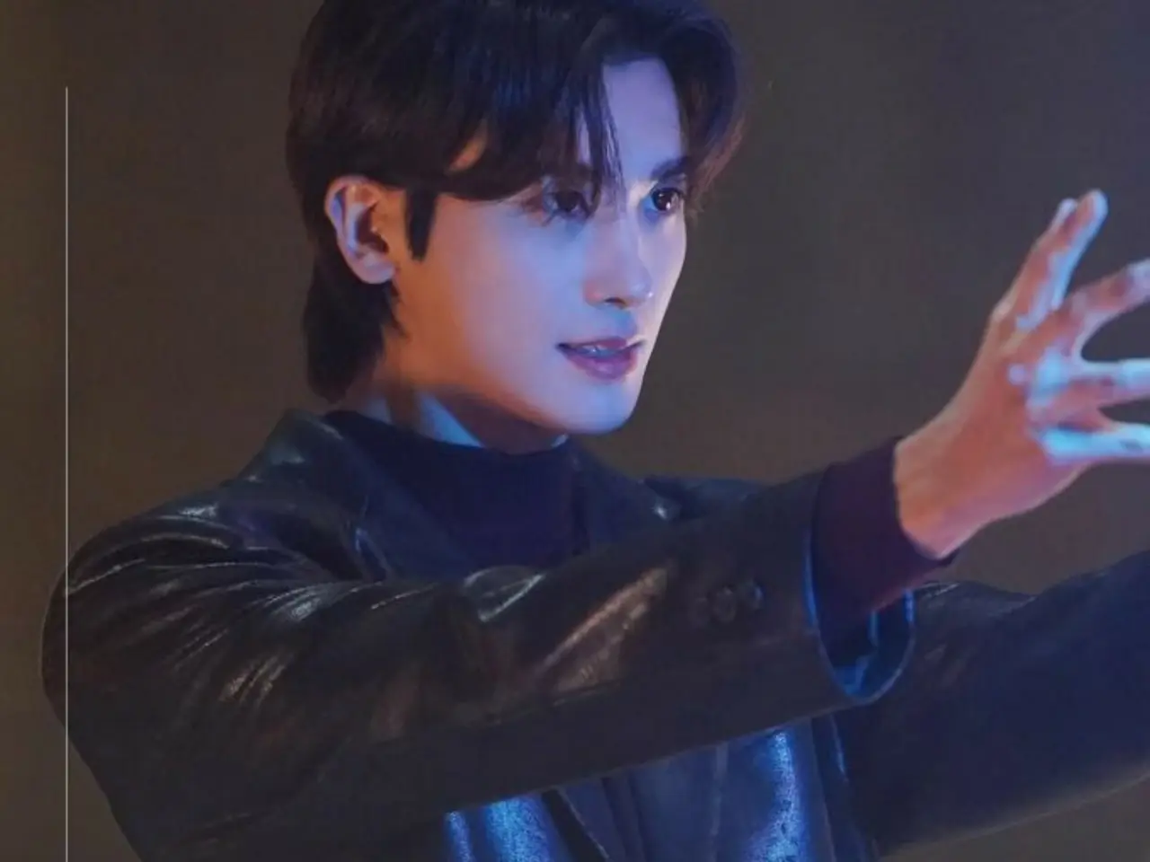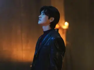 Bức ảnh cho thấy Park Hyung Sik mặc một chiếc áo khoác da tối màu và đắm mình trong ánh sáng tối.