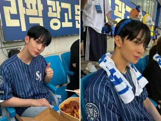 Trong bức ảnh được công bố, Bae Jinyoung mặc đồng phục Samsung và đeo khăn cổ vũ.