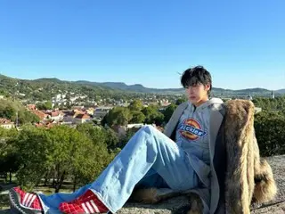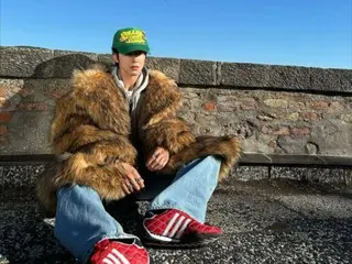 Yunho (U-KNOW) đang thu hút sự chú ý với tư thế táo bạo, ngồi nặng nề trên vỉa hè lát đá dưới bầu trời trong xanh.